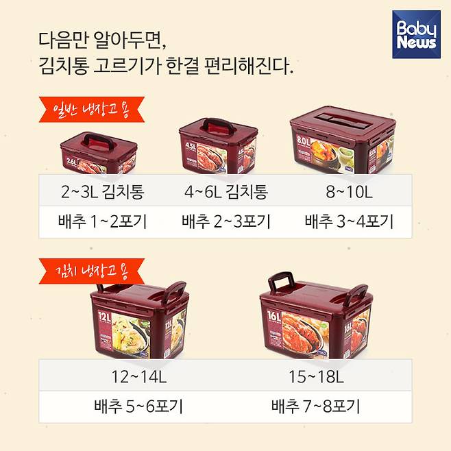 6. 다음만 알아두면 김치통 고르기가 한결 편리해진다. 일반 냉장고용은 2~3L 김치통에 배추 1~2포기가 들어가고, 4~6L 김치통에는 배추 2~3포기가 들어간다. 8~10L 김치통에는 배추 3~4포기가 들어간다. 김치냉장고용은 12~14L에 배추 5~6포기, 15~18L에 배추 7~8포기가 들어간다.