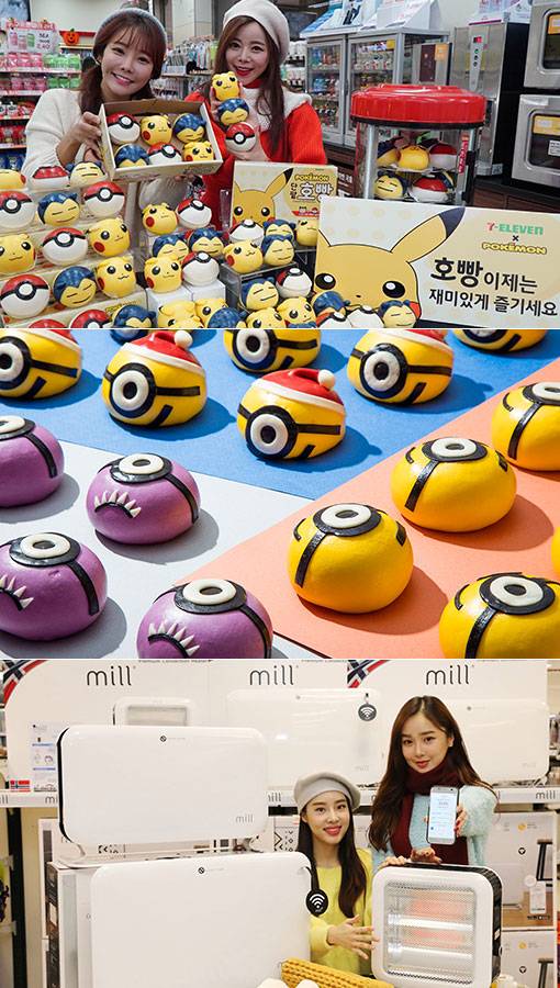 | 예년보다 이른 추위가 찾아오면서 유통업계의 겨울맞이가 한창이다. 세븐일레븐의 ‘포켓몬 캐릭터 호빵’, GS25의 ‘미니언즈 호빵’, 이마트의 ‘밀컨벡션히터’(위쪽부터). 사진제공 l 세븐일레븐·GS25·이마트 |