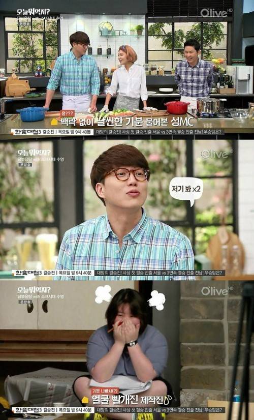성시경의 말에 여성 스태프는 빨개진 얼굴을 손으로 가리고 웃었고 소녀시대 수영이 “죄송하다”고 사과하자 여성 스태프는 두 팔로 하트를 그리며 미소로 화답했다.