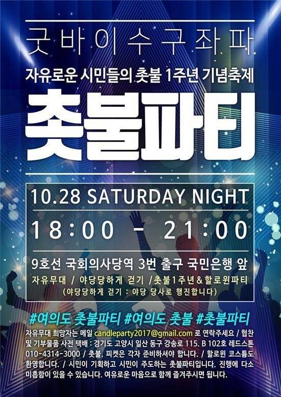 28일(토) 오후 촛불집회 1주년을 맞이한 기념식이 서울 여의도와 광화문에서 동시에 열리는 가운데 마음 맞는 시민들이 모여 개최하는 여의도 '촛불파티 2017' 행사가 구체적인 윤곽을 드러내며 기대감을 보였다.