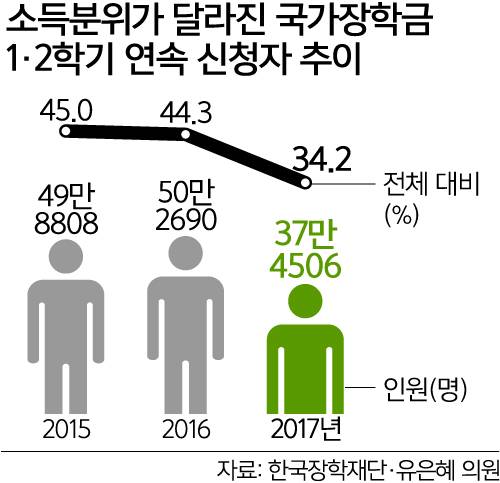 같은 대학생의 소득분위가 학기마다 달라진 경우는 더 많았다. 1·2학기 연속으로 국가장학금을 신청한 대학생 가운데 소득분위가 달라진 경우는 2015년 49만8808명(전체의 45.0%), 2016년 50만2690명(44.3%)이었다. 소득분위 산정이 절대평가로 바뀐 2017년에도 37만4506명, 즉 34.2%의 소득분위가 바뀌었다.
