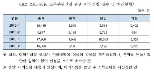 장학재단에 따르면 지난 2년 간 국가장학금 소득분위 산정에 대한 이의신청 접수 건수는 총 5만3541건이었다. 이중 이의신청이 받아들여져 소득분위를 재산정한 경우는 전체의 61.8%인 3만3077건이었다. 당초 소득 9∼10구간으로 산정돼 장학금을 받지 못하다가 다시 1∼8구간으로 재분류돼 장학금을 받은 경우는 4992명이었다.