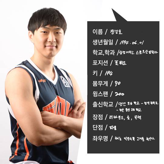부산중앙고 출신으로, 고교시절 천기범, 홍순규 등과 활약했던 정강호는 지난 시즌 상명대에서 득점 2위(19.4점) 리바운드 5위(11.5개) 블록 1위(2.1개)에 이름을 올렸다.