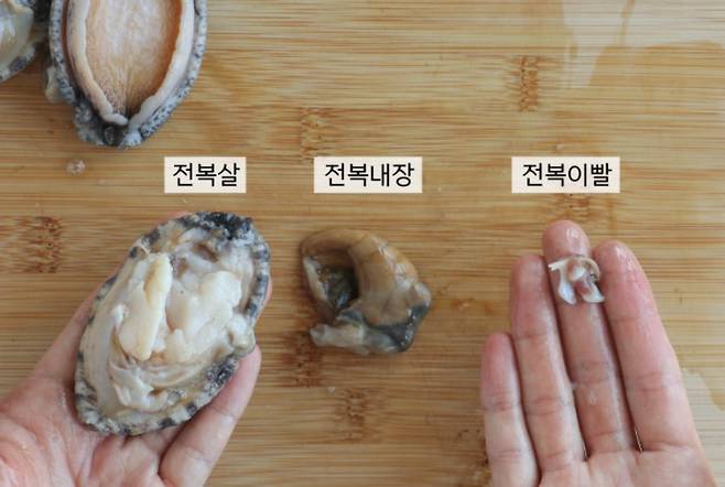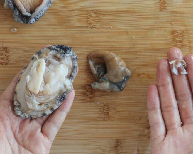 3. 전복 내장을 분리하고, 전복 이빨 부분을 제거한다.