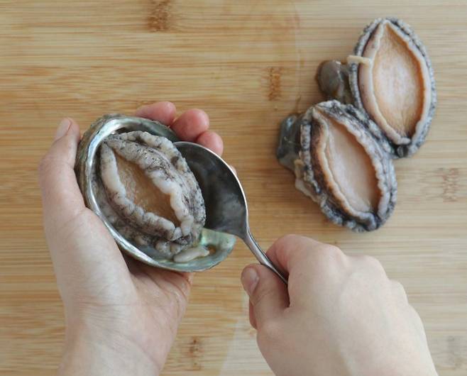 2. 칼 또는 숟가락을 사용해 전복을 떼어낸다.