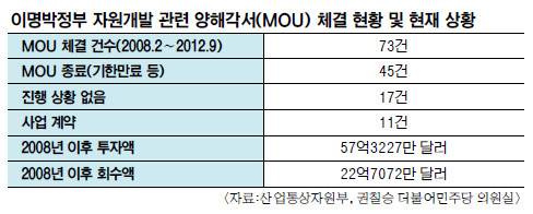 이명박정부가 역점 사업으로 홍보하며 체결한 해외 자원개발 관련 양해각서(MOU) 가운데 85%가 사업으로 이어지지 못하고 종료되거나 현재까지도 진행 상황이 없는 것으로 드러났다.