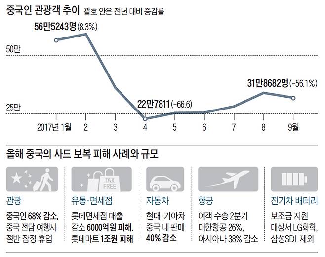 중국 정부의 한국 단체 관광 상품 전면 금지 조치로 3월부터 9월까지 중국인 관광객은 203만6215명으로 작년(633만6312명)보다 68% 감소했다. 이 여파로 롯데면세점은 6000억원가량 피해를 봤고, 아모레퍼시픽도 3분기까지 영업이익이 32.4% 감소했다.
