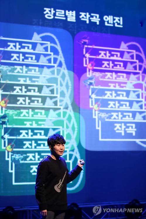 (서울=연합뉴스) 진연수 기자 = 1일 서울 동대문구 KOCCA 콘텐츠시연장에서 열린 한국콘텐츠진흥원과 SM엔터테인먼트가 공동으로 진행한 음악과 인공지능 기술 협업 프로젝트 쇼케이스에서 휴멜로 x 킴 케이트, 랜덤웍스 팀이 AI와 협업 프로젝트에 대해 발표하고 있다. 2017.11.1