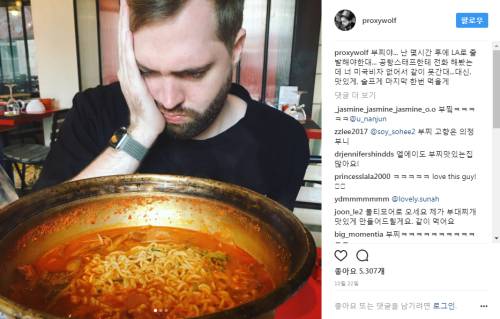 그는 자신의 인스타그램에 부대찌개를 앞에 두고 울상인 사진을 올리며 "부찌야... 난 몇 시간 후에 LA로 출발해야 한대... 공항 스태프한테 전화해봤는데 너 미국비자 없어서 같이 못간대...대신, 맛있게, 슬프게 마지막 한 번 먹을게"라고 적었다.