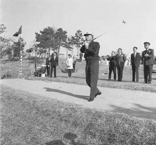 | 1966년 11월5일 서울 태릉CC 개장식에서 티샷하고 있는 박정희 전 대통령. 지금은 박물관에서나 볼 수 있는 퍼시먼 드라이버가 이채롭다. 주변을 경계 중인 경호원과 더불어 멀리 뒤편에 군악대의 모습도 보인다. |
