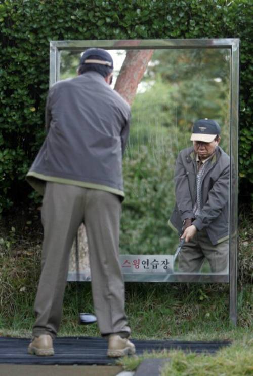 | 골프 라운드에 들어가기 전 거울을 보면서 연습에 몰두하고 있는 노무현 전 대통령. 성격답게 철저히 준비한 뒤 '결전'을 치르곤 했다. |