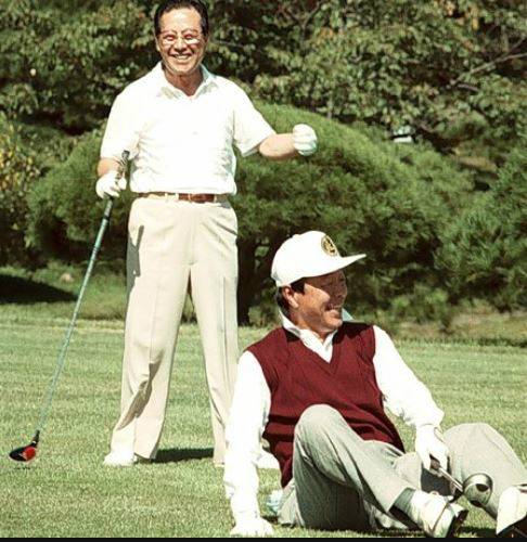 | 1989년 10월 경기 안양CC에서 드라이버 티샷을 하면서 미끄러져 엉덩방아를 찧은 김영삼 당시 통일민주당 총재(오른쪽)와 이를 바라보고 폭소를 터뜨린 김종필 신민주공화당 총재. YS는 이날 17년 만에 처음 다시 골프채를 잡았다. |