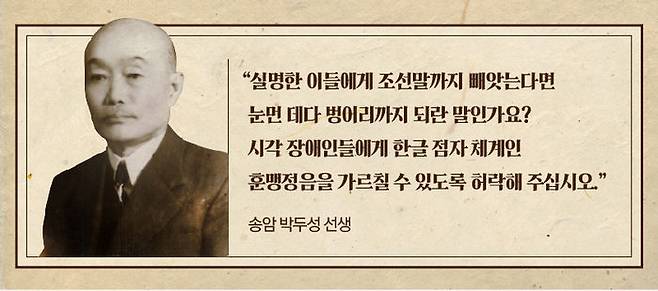 그 뒤 시각장애를 가진 아이들이 모인 학교인 조선총독부 제생원 내 맹아부에 발령된 박 선생은 청각 교육에 한정된 우리나라 맹교육의 현실을 깨닫게 됩니다. 당시 학생들은 일본 점자로 왜곡된 역사를 배우고 있었습니다. 1919년 3·1운동 이후 일제의 탄압이 심해져 조선어 과목을 없애려 하자 박 선생은 강력하게 항의했습니다.