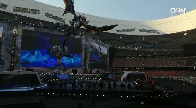 레전드 네버 다이가 흐르는 동안 실제 게임과 같은 일이 일어났다. 리그 오브 레전드 게임이 시작될 때 멀리서 드래곤이 날아 들어오는 것처럼 국립 경기장 안으로 드래곤이 날아 들어오는 장면이 증강 현실을 활용해 보여진 것. 버드 네스트라고도 불리는 국립 경기장의 지붕부터 날아 들어온 드래곤은 경기장 곳곳을 돌고 돌아 메인 무대까지 들어오면서 사전 행사를 빛냈다.