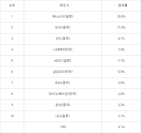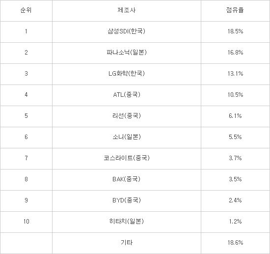 최근 급부상한 전기차용 중형 배터리 시장에서 지난해 기준으로 일본과 중국 업체가 1~3위를 석권했다. 앞으로 전기차 배터리 경쟁에서 밀리면 한국이 일본, 중국에 밀려 3위로 떨어질 수 있다는 우려도 제기된다.
