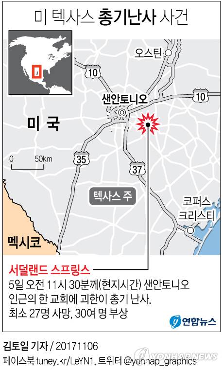 텍사스 주 샌안토니오 인근 마을인 서덜랜드 스프링스의 한 교회에 이날 무장 괴한이 난입한 뒤 총기를 난사해 모두 26명이 사망하고 20여 명이 부상했다고 미 주요 방송사들이 텍사스 경찰의 발표를 인용해 보도했다.