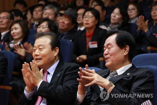 (서울=연합뉴스) 한국자유총연맹이 6일 오후 부산 자유회관에서 개최한 '부산시지부 설립 51주년 통일선봉 자유가치 확산의 날 기념식'에서 김경재 총재(오른쪽)와 양재생 부산시지부 회장이 박수 치고 있다. 2017.11.6 [한국자유총연맹 제공=연합뉴스]