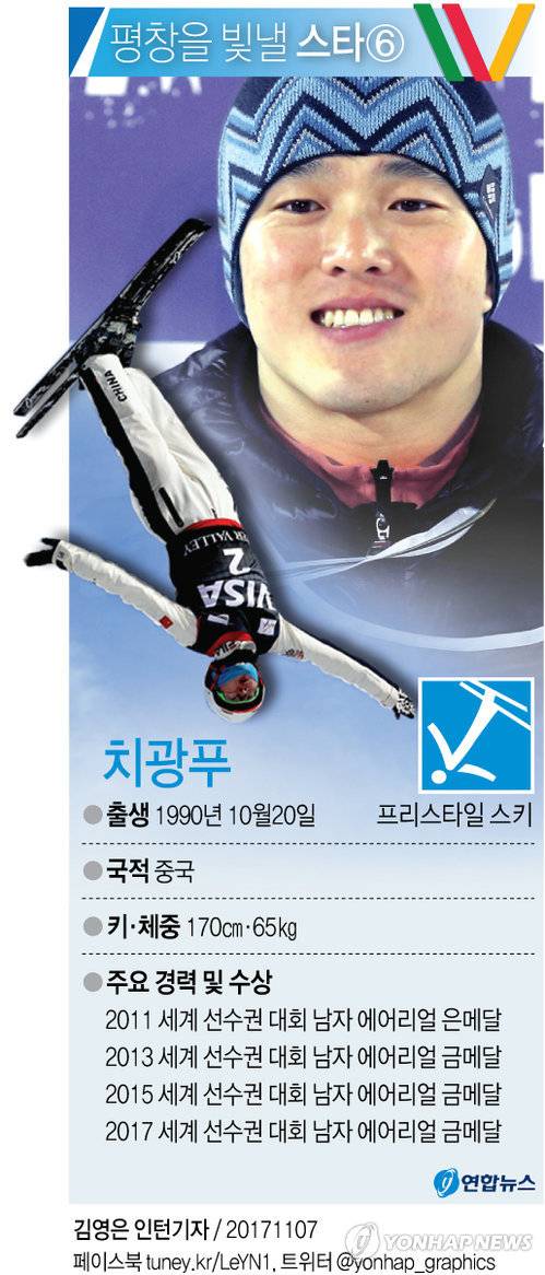 (서울=연합뉴스) 김토일 기자 = 치광푸(27·중국)라는 이름은 일반인들에게는 당연히 생소한 이름이지만 스키 프리스타일 에어리얼 종목에서는 많은 선수에게 '롤 모델'로 인정받는 선수로 2013년과 2015년 세계선수권대회 2연패를 달성했고 2014-2015시즌 월드컵 3승, 2015-2016시즌 2승 등 남자 에어리얼에서 단연 독보적인 존재다.