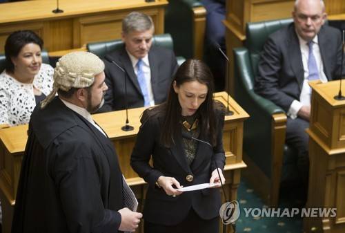 New Zealand Prime Minister Jacinda Arden, right, takes the oath during the Commission Opening of Parliament, in Wellington, New Zealand, Tuesday, Nov. 7, 2017. The Commission Opening for New Zealand's 52nd Parliament gets the House in session before the State Opening on Wednesday, Nov. 8 when the Governor-General Dame Patsy Reddy will read the speech from the Throne, setting out the government's agenda. (Mark Mitchell/New Zealand Herald via AP)