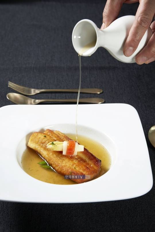 '동국장 맑은 국을 곁들인 거제도 가자미 구이'는 트럼프 대통령이 가장 좋아하는 생선요리이자 지난 백악관 만찬에서 문재인 대통령을 위한 메뉴이기도 했던 가자미 구이를 활용해 만든 요리로 특히 문 대통령의 고향인 거제도 가자미로 만들었습니다.