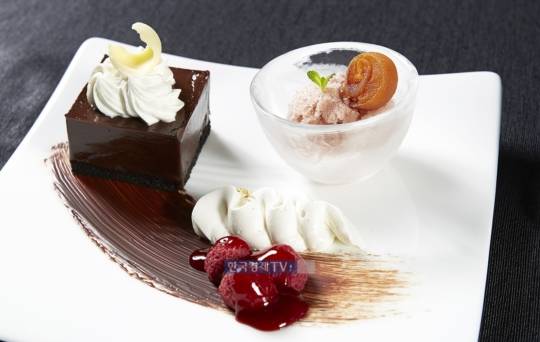 산딸기 바닐라 소스를 곁들인 트리플 초콜릿 케이크와 감을 올린 수정과 그라니타