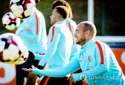 epa06313667 Dutch national soccer team player Wesley Sneijder (front) performs during his team's training session in Katwijk, Netherlands, 07 November 2017. The Dutch team will face Scotland in an International Friendly soccer match on 09 November 2017. EPA/REMKO DE WAAL