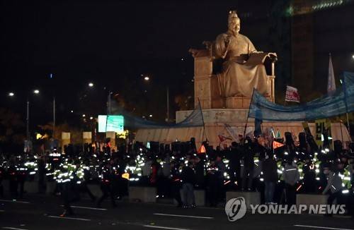(서울=연합뉴스) 김인철 기자 = 7일 오후 서울 종로구 광화문광장에서 열린 전쟁반대 평화실현 국민촛불에 참가한 참가자들이 도널드 트럼프 미국 대통령 이동 경로에 야광봉과 물병 등을 던지고 있다. 2017.11.7