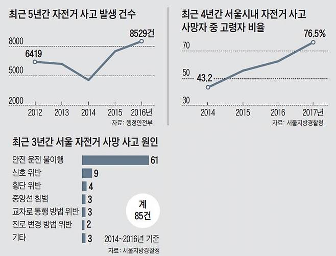 고령 자전거 운전자의 부주의한 운전으로 인한 사망 사고도 해마다 늘고 있다. 서울지방경찰청에 따르면 올해 7월까지 자전거 교통사고 사망자 17명 중 13명이 65세 이상이다. 자전거 사고 사망자 중 고령자 비율은 2014년 43.2%에서 올해 76.5%로 급증했다.