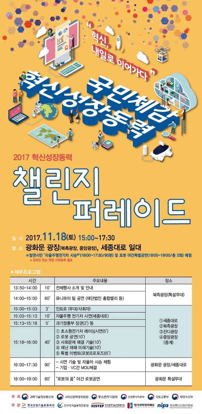 과학기술정보통신부는 18일 서울 광화문광장과 세종대로 일대에서 '2017 혁신성장동력 챌린지퍼레이드'를 개최한다고 9일 밝혔다.