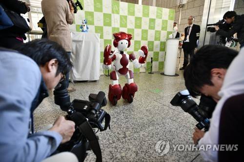epa06317530 TV cameramen film the humanoid robot EMIEW3 at the Tokyo Metropolitan Government (TMG) building in Tokyo, Japan, 09 November 2017. Multilingual service robots will welcome and assist visitors during their visit at the TMG. Multilingual robots are expected to play various roles during the Tokyo 2020 Olympic Games. EPA/FRANCK ROBICHON