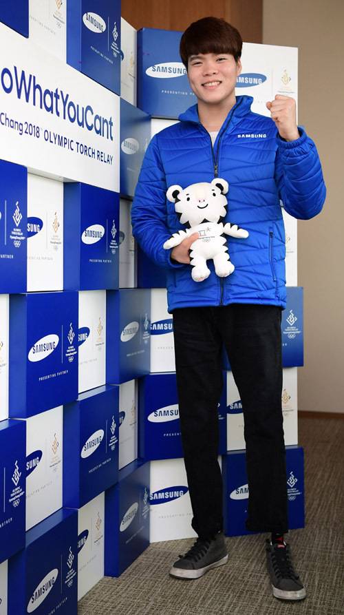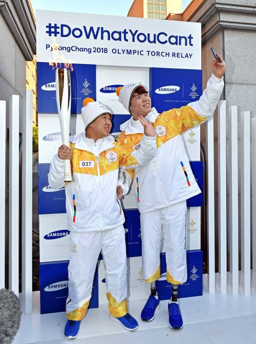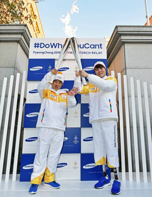 | 삼성 성화주자 로봇다리 김세진이 장애인 수영 선수 김동훈 군(김해 경운중)에게 전하는 희망과 도전의 불꽃 지체장애인의 날인 지난 11일, 삼성 성화봉송 주자 김세진(전 장애인 수영 국가대표)이 전국장애인수영대회서 신인선수상을 받은 김동훈(경운중, 14) 군에게 꿈과 열정을 응원하는 성화의 불꽃을 전달하고 있다. 삼성전자는 2018 평창 동계올림픽 성화봉송 공식 후원사로 한계를 극복하고 끊임없이 도전하는 열정을 응원한다는 의미의 '불가능을 가능케 하라(Do What You Can’t)' 캠페인을 펼친다. |