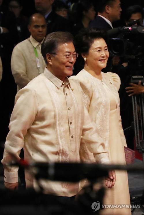(마닐라=연합뉴스) 김주형 기자 = 문재인 대통령과 부인 김정숙 여사가 12일 오후(현지시간) 필리핀 마닐라 몰오브아시아 SMX 컨벤션 센터에서 열린 '아세안(ASEAN 동남아시아국가연합) 50주년 기념 갈라만찬'에 필리핀 전통복장을 입고 입장하고 있다. 2017.11.12