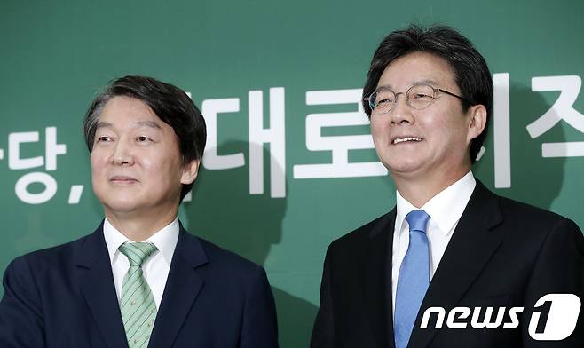 (서울=뉴스1) 안은나 기자 = 유승민 바른정당 신임 대표가 14일 오후 서울 여의도 국회에서 안철수 국민의당 대표를 만나 악수하고 있다. 2017.11.14/뉴스1