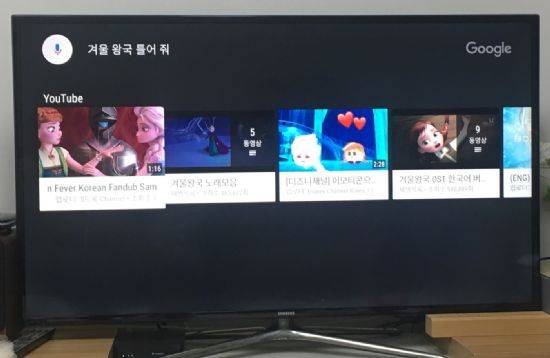 리모컨으로 음성 검색도 가능합니다. 리모컨 마이크 버튼을 누르고 보고 싶은 콘텐츠를 말하면 유뷰트에서 검색해주는 수준으로 작동됩니다. 예를 들어 '겨울왕국'이라고 말하면 유튜브에서 겨울왕국 관련된 동영상을 검색해 줍니다. 내년 상반기엔 구글 어시스턴트 기능이 탑재될 예정이어서 더 다양한 인공지능 기능을 사용할 수 있게 될 예정입니다.