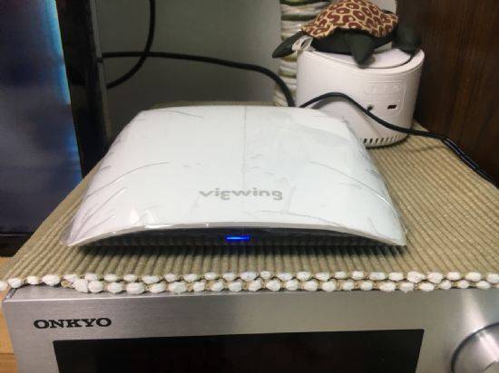먼저 뷰잉을 설치하기 위해 상자를 열어보니 셋톱박스처럼 생긴 디바이스와 리모컨, HDMI 케이블이 들어 있습니다. HDMI 케이블로 TV와 뷰잉 디바이스에 연결하니 기기에 파란 불이 들어오면서 실행됩니다.