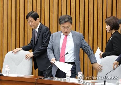 (서울=연합뉴스) 안정원 기자 = 14일 오후 국회에서 열린 이진성 헌법재판소장 후보자 임명동의에 관한 인사청문특별위원회 전체회의에서 진영 위원장(왼쪽)과 자유한국당 윤상직 간사, 더불어민주당 한정애 간사가 입장하고 있다.