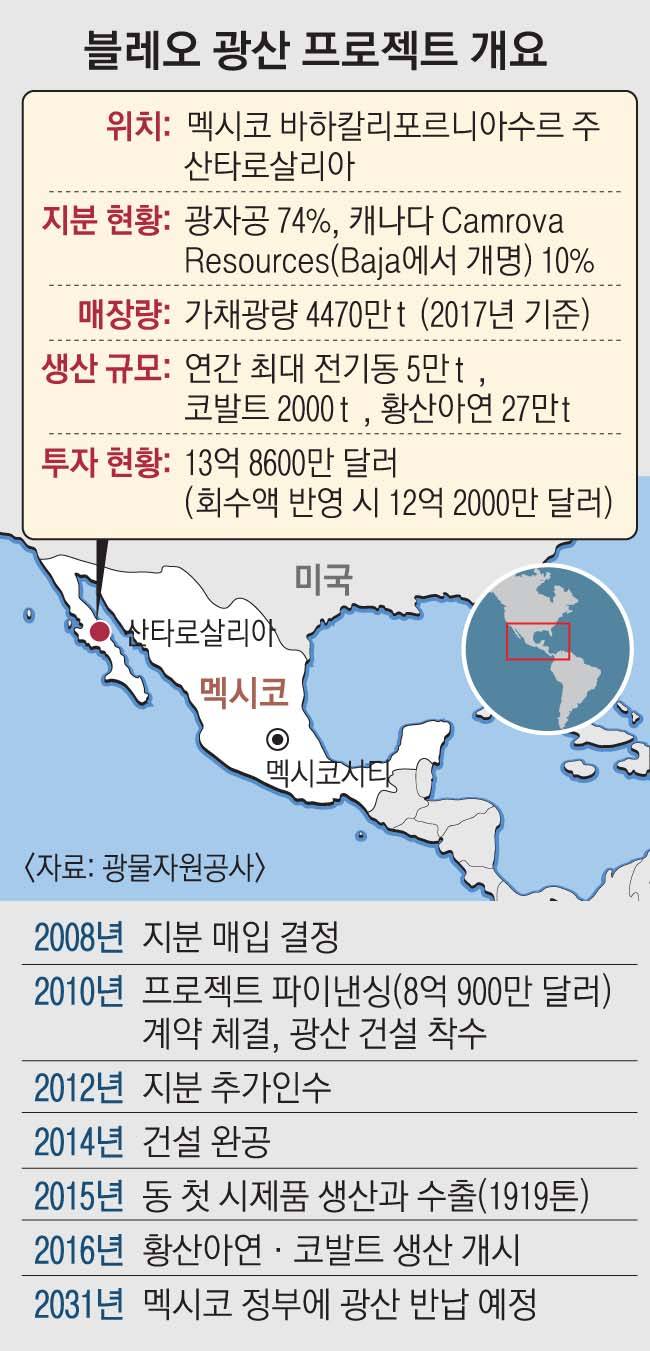 광물공사는 MB정부 출범 첫해인 2008년 멕시코 바하반도에 위치한 볼레오 구리광산 개발사업에 뛰어들었다. 지금까지 들어간 돈만 13억 8600만 달러다. 반면 회수액은 지난해 말 현재 1억 6000만 달러다. 광물공사 측은 “지금 손을 떼면 투자금(기존 회수액을 뺀 12억 2600만 달러)을 전부 날리지만 사업을 계속하면 5100만 달러는 건질 수 있다”고 주장한다. 설사 볼레오 구리사업을 계속 끌고 가더라도 이미 11억 달러 이상의 손실이 불가피하다고 내부적으로 판단하고 있는 것이다. 보증채권 6억 5000만 달러를 합하면 손실 규모는 18억 달러(약 2조여원)가 넘는다.