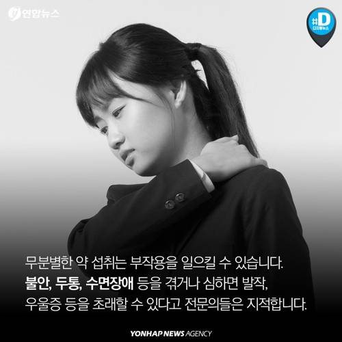 무분별한 약 섭취는 부작용을 일으킬 수 있습니다. 불안, 두통, 수면장애 등을 겪거나 심하면 발작, 우울증 등을 초래할 수 있다고 전문의들은 지적합니다.