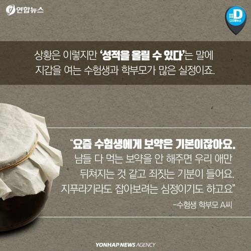 "요즘 수험생에게 보약은 기본이잖아요. 남들 다 먹는 보약을 안 해주면 우리 애만 뒤쳐지는 것 같고 죄짓는 기분이 들어요. 지푸라기라도 잡아보려는 심정이기도 하고요" -수험생 학부모 A씨
