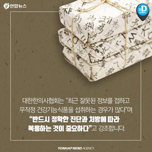 대한한의사협회는 "최근 잘못된 정보를 접하고 무작정 건강기능식품을 섭취하는 경우가 많다"며 "반드시 정확한 진단과 처방에 따라 복용하는 것이 중요하다"고 강조합니다.