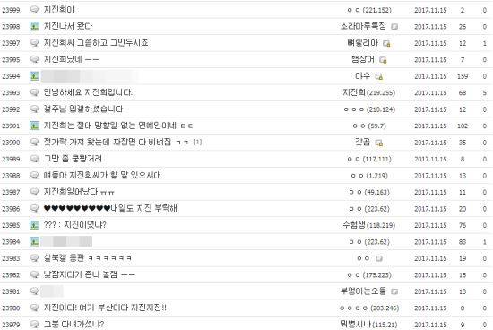 네티즌들은 댓글을 통해 ”기상청보다 빠른 지진희갤 ㅇㅈ합니다” “수능 잘 보게 해주세요” “전역하게 해주세요” “공시 합격하게 해주세요” 등 다양한 반응을 보이고 있다. 지진희 갤러리에는 현재 “지진희야!” “지진희났네..” “젓가락 가져왔는데 짜장면 다 비벼짐” “수능 최저 맞추게 해주세요” 등 다양한 제목의 글들도 실시간으로 올라오고 있다.