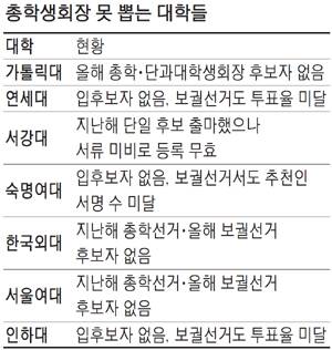 한때 정치권 등용문으로 통했던 대학 총학생회장 자리는 아예 후보자를 찾지 못해 안달이다.