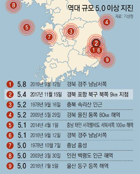기상청은 포항 지진을 2011년 3월 동일본 대지진 여파로 보고 있다. 이진한 고려대 지구환경과학과 교수는 “올해 봄 일본 구마모토에서 일어난 지진 등 일본 쪽 영향을 받았을 가능성이 있다”고 말했다. 이는 지난해 경주 지진, 올해 포항 지진 등 앞으로 한반도에서 규모 5.0 이상의 지진이 발생하는 빈도가 급격히 증가할 수 있다는 의미다.
