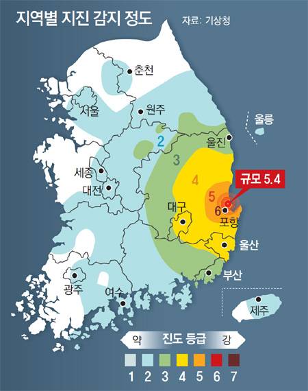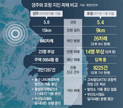 15일 오후 2시 29분 발생한 경북 포항 지진(규모 5.4)은 지난해 9월 12일 발생한 경주 지진(규모 5.8도)보다 규모는 작았지만 진동은 비슷했다.