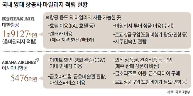 국토교통부 등에 따르면, 두 항공사의 전체 마일리지 적립 규모는 대한항공이 1조9127억원, 아시아나항공 5476억원 등 약 2조5000억원에 이르는 것으로 나타났다. 해외여행이 일반화하면서 항공마일리지를 소유한 사람은 최소 2000만명 이상으로 추정돼, 항공사 고객 1인당 평균 12만원어치의 마일리지를 쌓아두고 있는 셈이다.