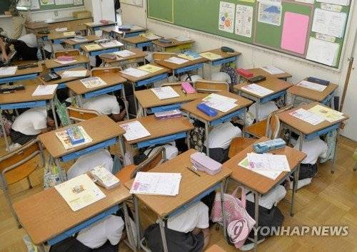 | (와지마<이시카와현> 교도=연합뉴스) 30일 일본 정부와 이시카와(石川)현이 현내 와지마(輪導)시에서 실시한 미사일 대피훈련에서 초등학생들이 창을 등진 채로 책상 밑에서 몸을 웅크리며 머리를 감싸고 있다. 2017.8.30 /사진=연합뉴스 |