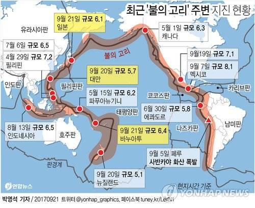| [그래픽] 최근 '불의 고리' 주변 지진 현황 /사진=연합뉴스 |