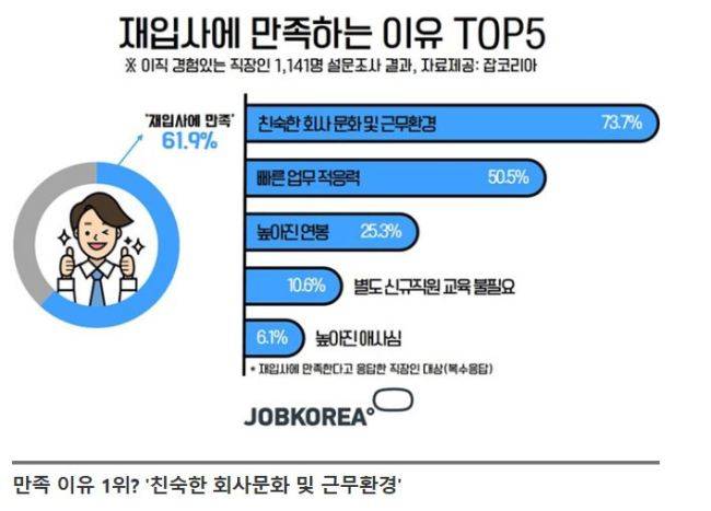 잡코리아가 재입사에 만족하는지를 묻자 61.9%가 ‘만족한다’고 응답한 것. 이들은 재입사에 만족하는 가장 큰 이유로 회사문화 및 근무환경이 친숙해서(73.7%) 꼽았다.