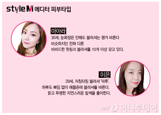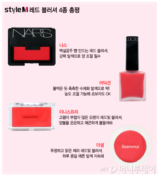스타일M 에디터들은 뷰티족 사이에서 인기를 끌고 있는 인기 레드 블러셔 4종을 사용해봤다. 선명한 빨간 발색이 돋보이는 △나스 △어딕션 △더샘 △이니스프리의 레드 블러셔를 직접 평소 메이크업에 활용해봤다.