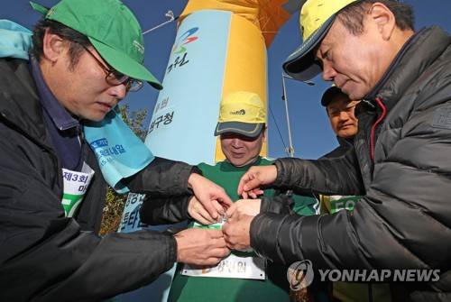 (서울=연합뉴스) 김도훈 기자 = 국민의당 안철수 대표가 19일 오전 서울 노원구 창동교에서 열린 노원구청장배 마라톤대회에 출전, 관계자들이 번호표를 달아주려 하자 이를 사양하고 직접 달고 있다. 2017.11.19